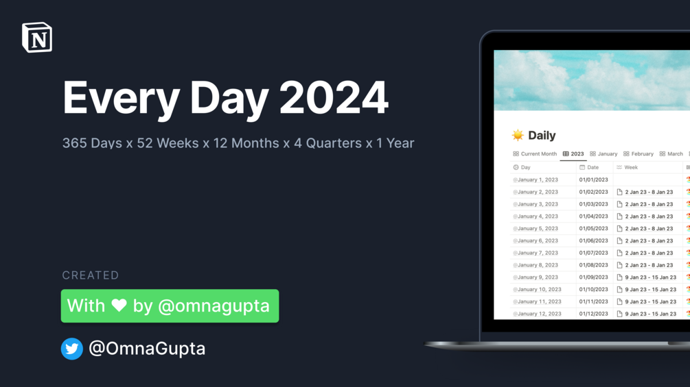 Build your personal dashboard on Notion over these 2024 databases for quick daily entries and weekly, monthly summaries. Everyday is linked with its week, month, quarter and year.