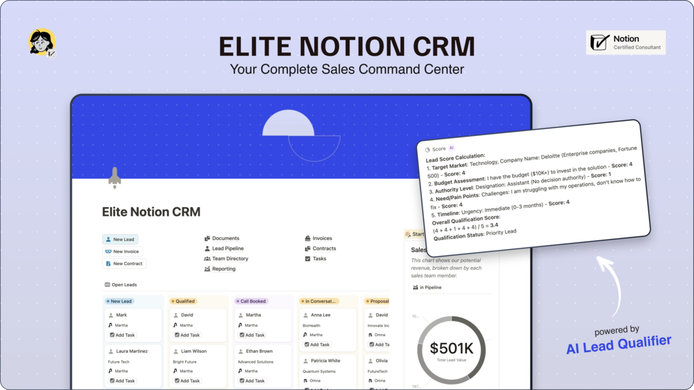 Introducing the Elite Notion CRM – the AI powered sales management system that organizes your entire pipeline, automates busy work, and gives you crystal-clear visibility into what's actually happening with your deals.
